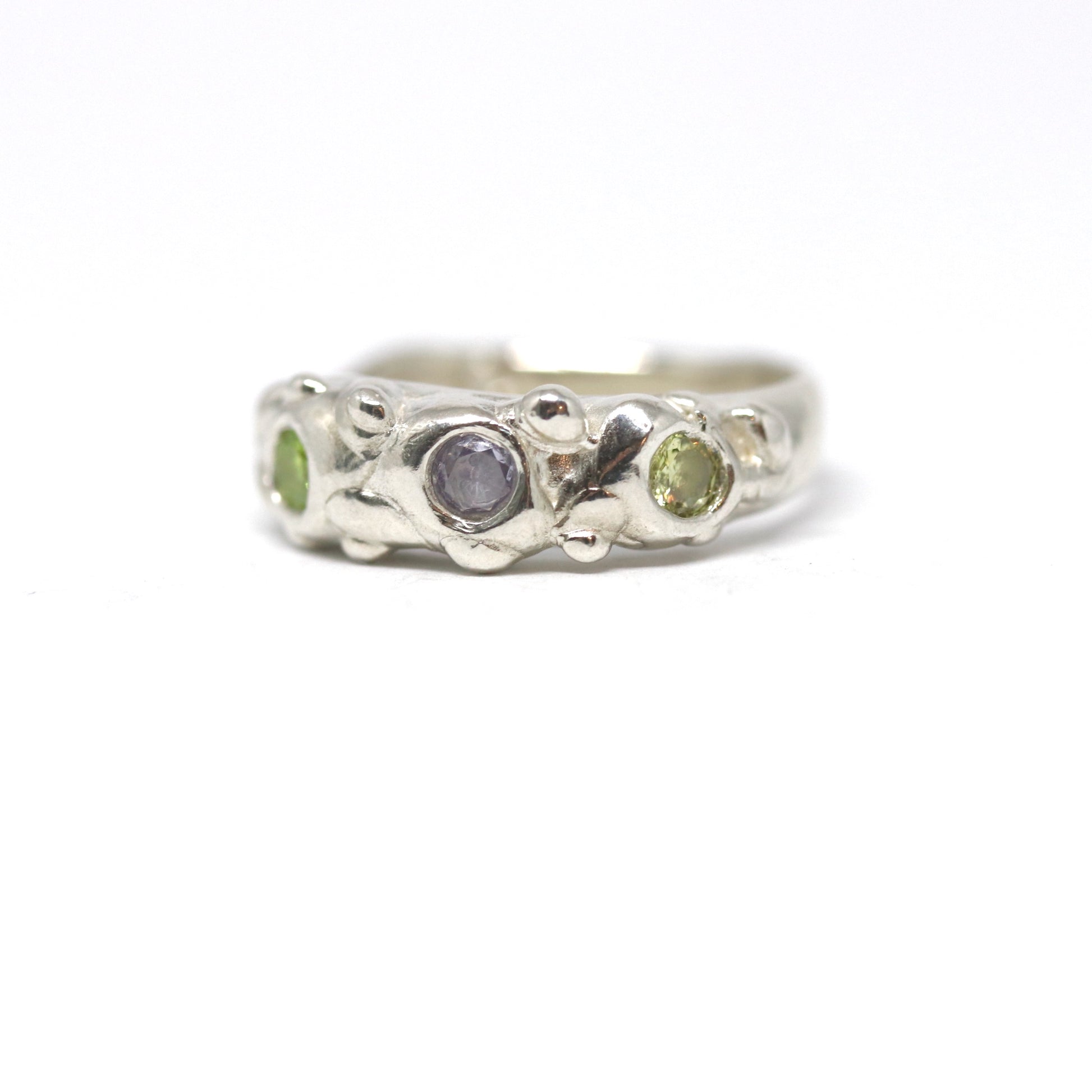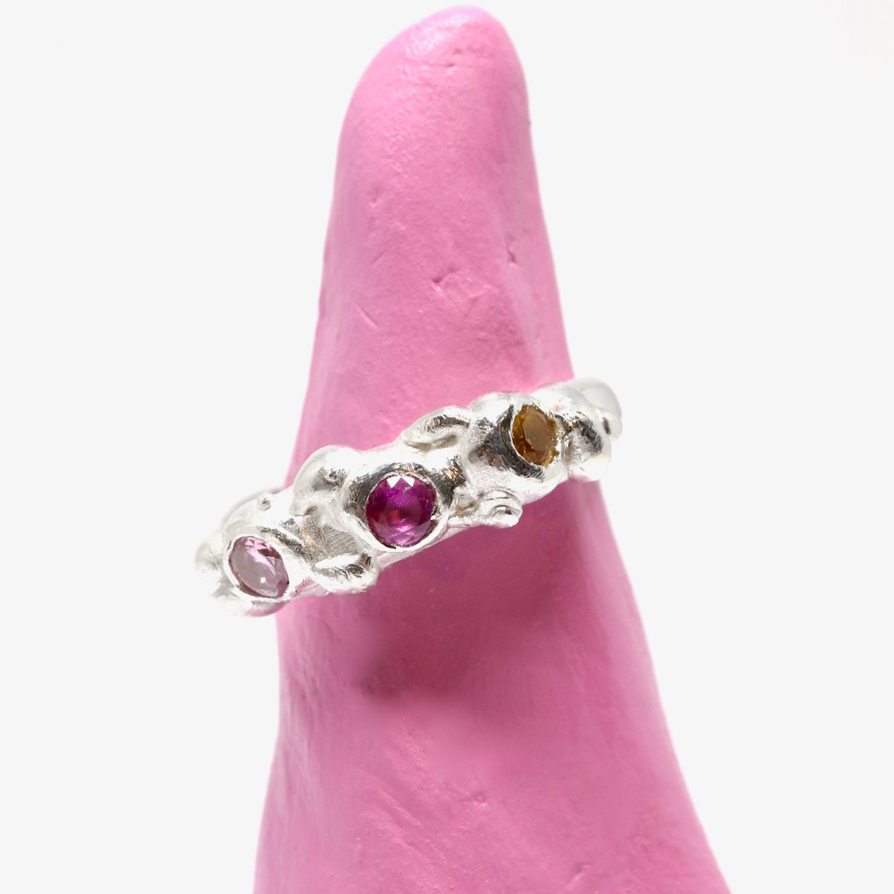 A sparkly little critter of a sterling silver ring with three cubic zirconia. If you like all things colourful and quirky this is the ring for you!