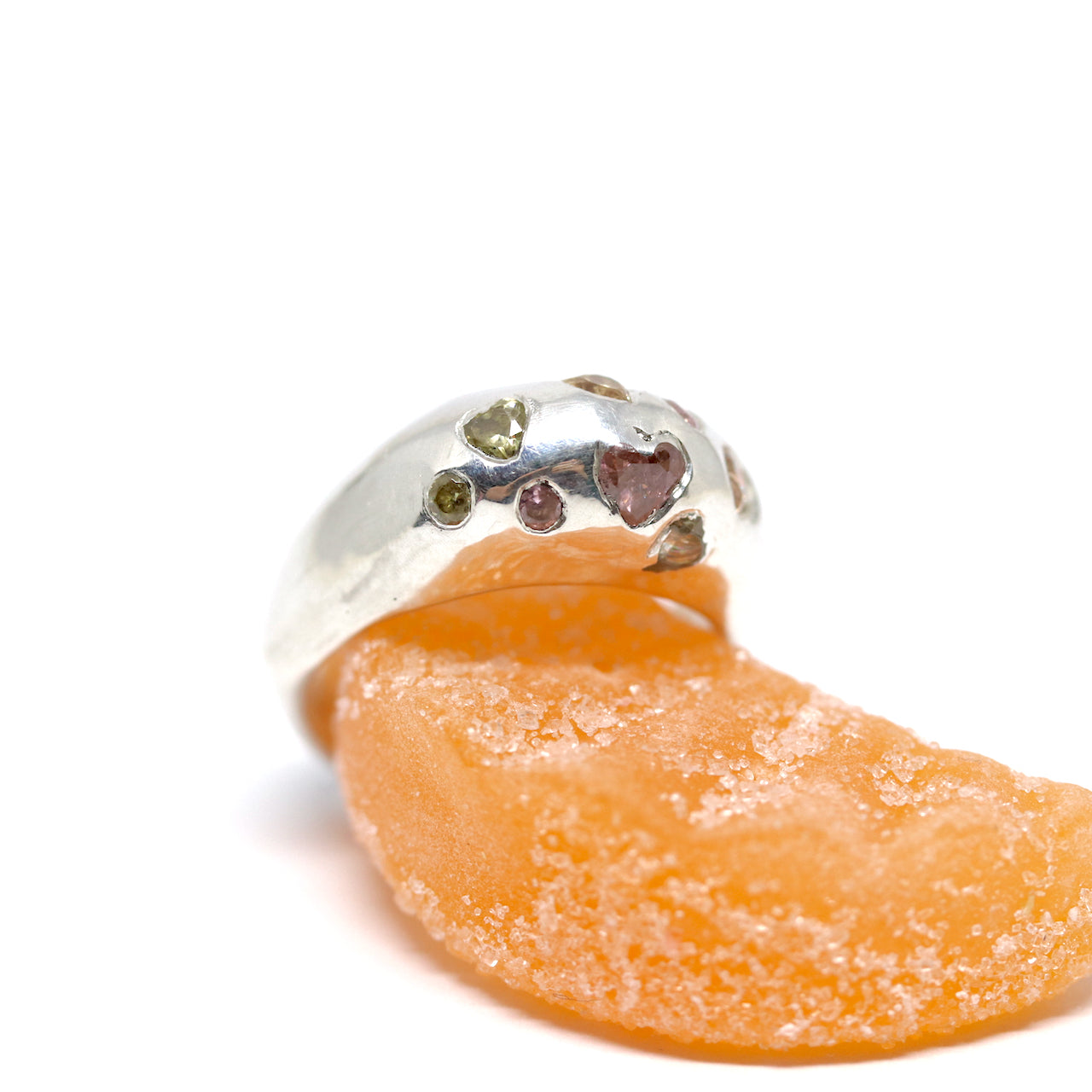 A shapely, high rise ring with scattering confetti of heart and round cubic zirconia cast in place. This ring is on sale as it was a design experiment and has some imperfections to the gems and surface.